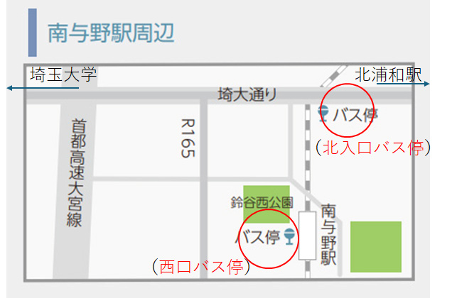 ※バスは、JR京浜東北線「浦和駅」、東武東上線「志木駅」からも出ています。ただし渋滞を考えると、南与野駅か、北浦和駅の利用がお勧めです。