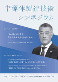| 講師:Rapidus株式会社 常務執行役員 赤堀浩史氏 題目:Rapidusが目指す先端半導体製造の現状と課題 〜精密プロセスを支える管理・制御技術〜 時間:13:30-14:30 会場:全学講義棟1号館3F 301室 参加費:無料(ただし、事前申込制) |